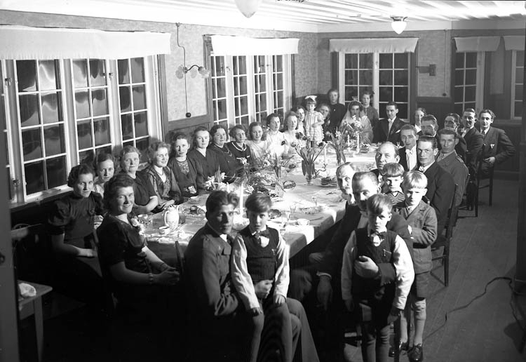 "Brudpar med gäster vid ett bord"