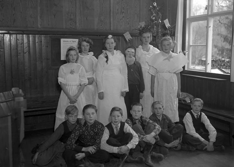 Text till bilden:"Lucia, tärnor, tomte. Pojkarna sitter på golvet".