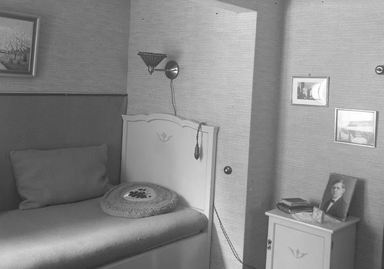 Text till bilden:"En säng, rund kudde, Nattduksbord med fotografi. Riksdagsman W. Svensson".