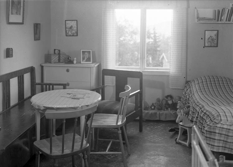 Text till bilden:"Träsoffa, runt bord, stolar, byrå, leksaker, dockor, två stycken trähästar. Riksdagsman W. Svensson".