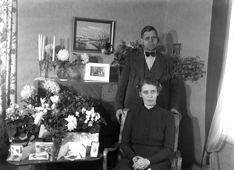 Text till bilden:"Man och kvinna firar högtidsdag. Interiör".