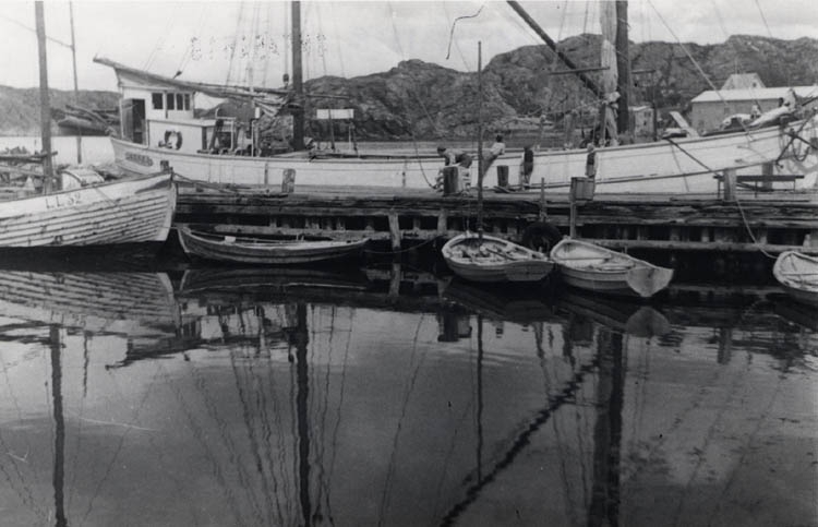 Gullholmen 1944. Bakom kajen syns det vita segelfartyget 7921 Greta av Kållandsö.