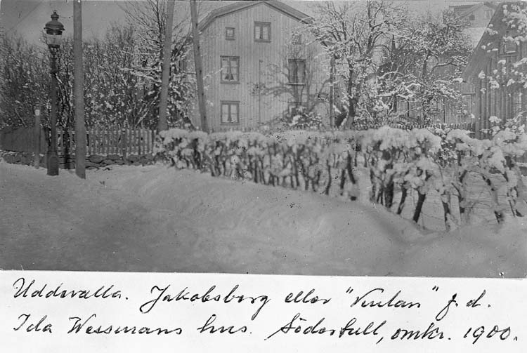 Text på kortet: "Uddevalla. Jakobsberg eller "Vesslan" f.d. Ida Wessmans hus Södertull, omkr 1900".