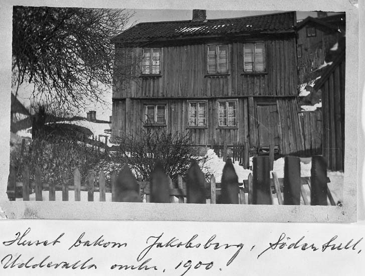 Text på kortet: "Huset bakom Jakobsberg, Södertull, Uddevalla omkr. 1900".