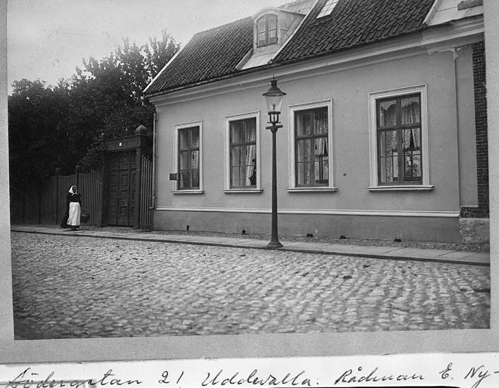 Text på kortet: "Södergatan 21 Uddevalla. Rådman E. Nyborgs fastighet 1905".