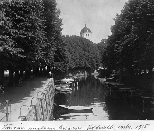 Text på kortet: "Bäveån mellan broarna, Uddevalla omkr. 1915".