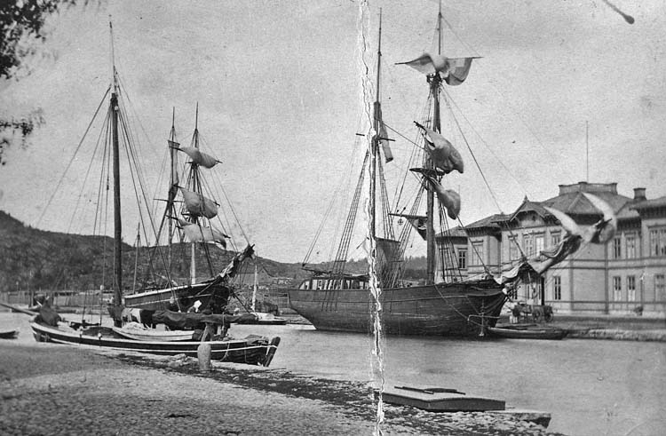 Handskrivet med bläck på bildens baksida: "Uddevalla hamn norra .....? framför järnvägsstationen".