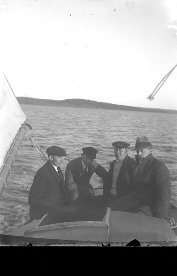 Enl. text i blå bok: "Fyra män i sittbrunnen på en segelbåt."