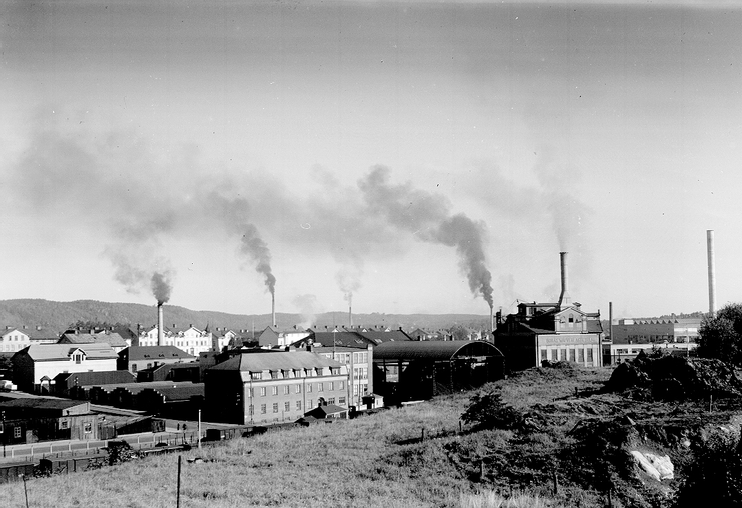 Vy från Krokshallsberget med Wäveribolagets Norrbyfabrik vid Magasinsgatan och Norrby-Trä t.v. i bild.