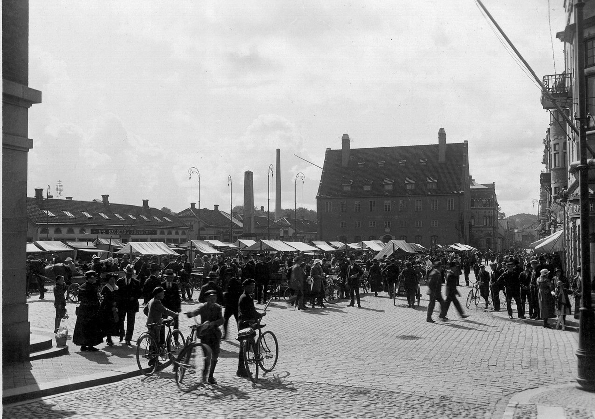 Stora Torget med torghandel från Torggatan med kvarteret Mercurius i mellanplanet år 1922.