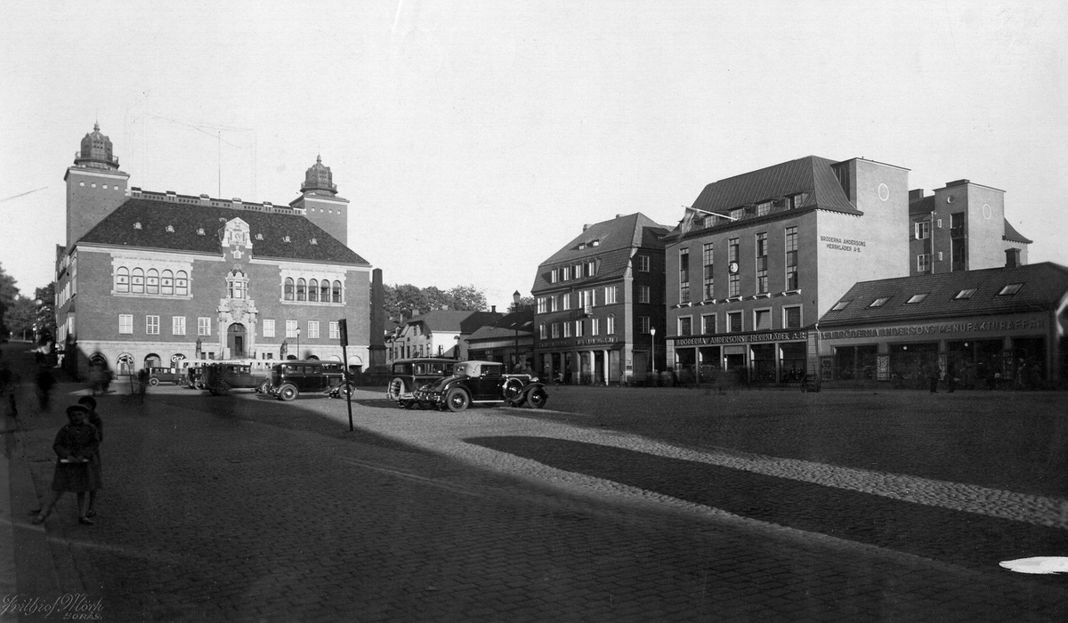 Stora Torget mot öster med Rådhuset i kvarteret Justitia i fonden år 1931.