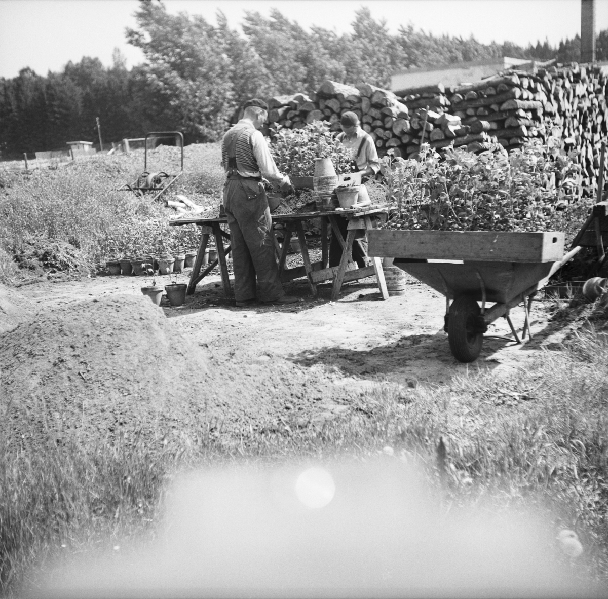 Två trädgårdsmästare står framför ett bord med blomkrukor och en skottkärra med plantor.