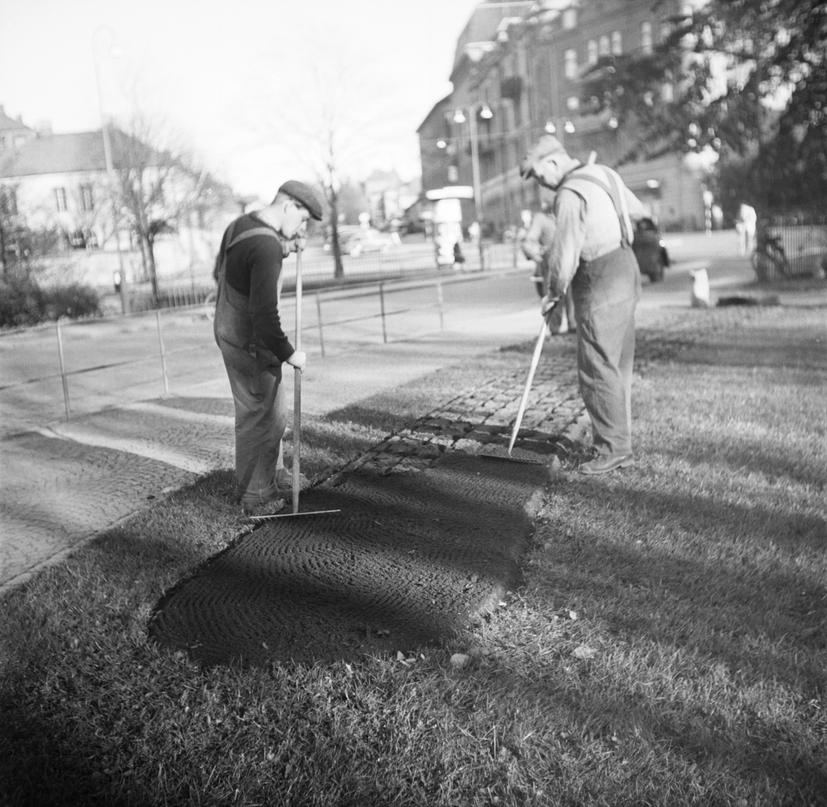 Två trädgårdsmästare krattar i en rabatt vid Nybron.