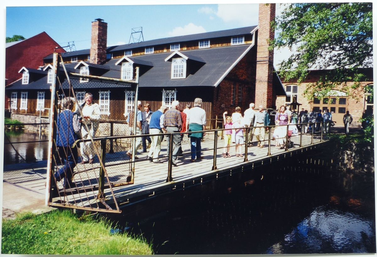 Invigning Forsviks bruk 2002. Besökare går över strömbron