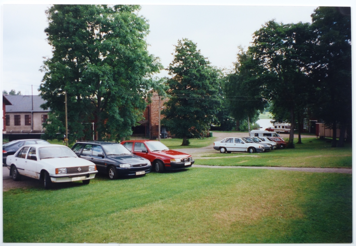 Bilar står parkerade på gräsmattan utanför Kafé Ada och Mjölnarbostaden