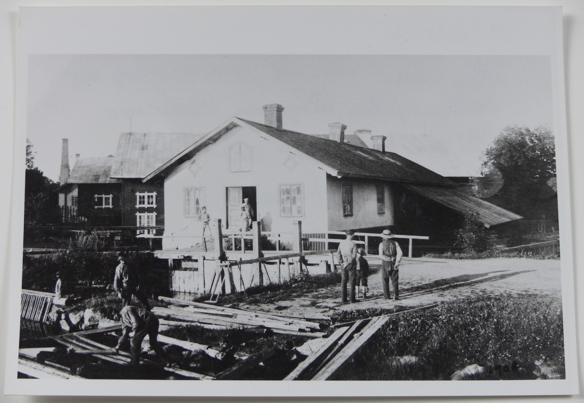 Svart-vit fotografi på Kvarnen, före rivning av vattenhjulen. Bryggan renoveras. Tre "skorstenar" därav troligen två ventilationshuvar.