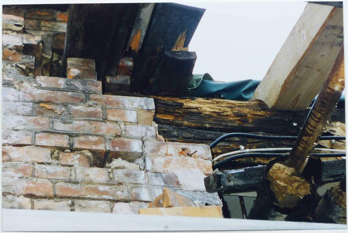 Gjuteriet, takskador vid riven tegelvägg vid f.d. sandbehållaren, fasad mot väster intill hissen