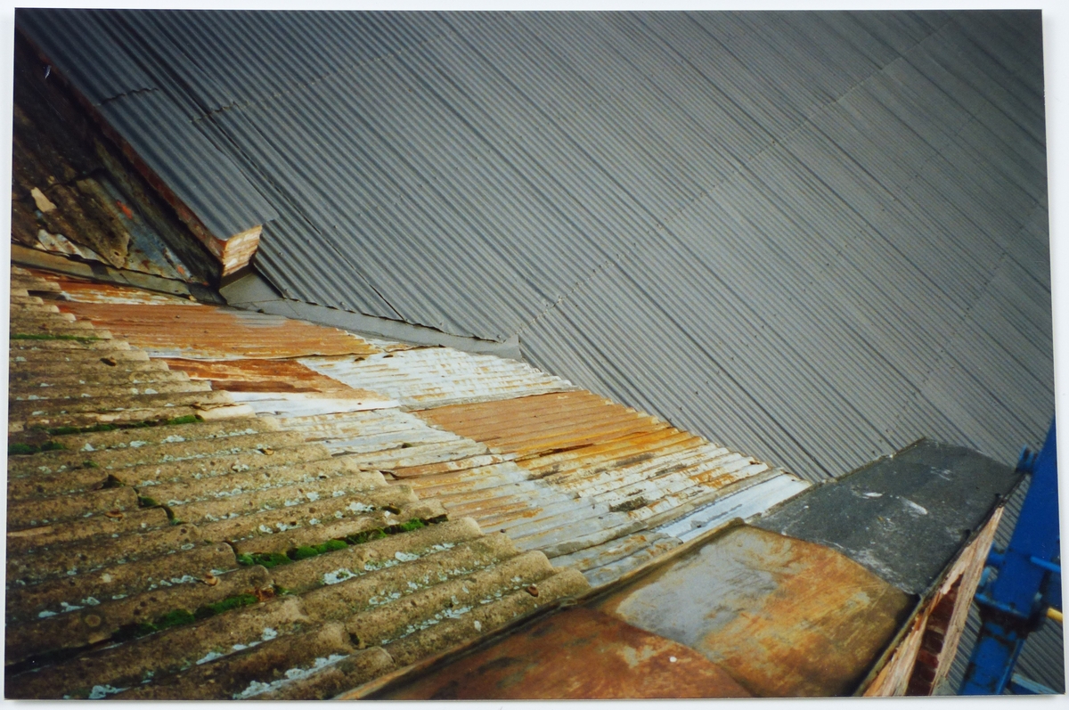 Brandmur ombyggd över taknivån, mellan verkstäderna, gjutjärnstäckt gavelmur till vänster, nedersta skivan nytillverkad