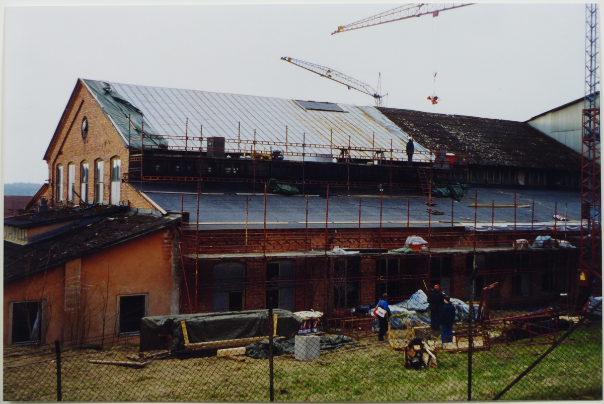Gjuteriet, takrestaurering, övre taket till vänster ny, ännu omålad skivtäckt järnplåt, till höger eternit, nedre taket underlagspapp för järnplåt.
