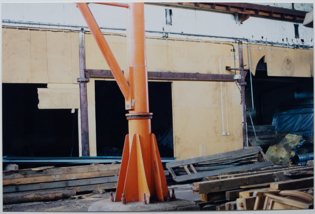 Titel: Gjuteriet, översiktsbild, interiör, tillfälligt materialupplag, taket fuktskadat på flera ställen