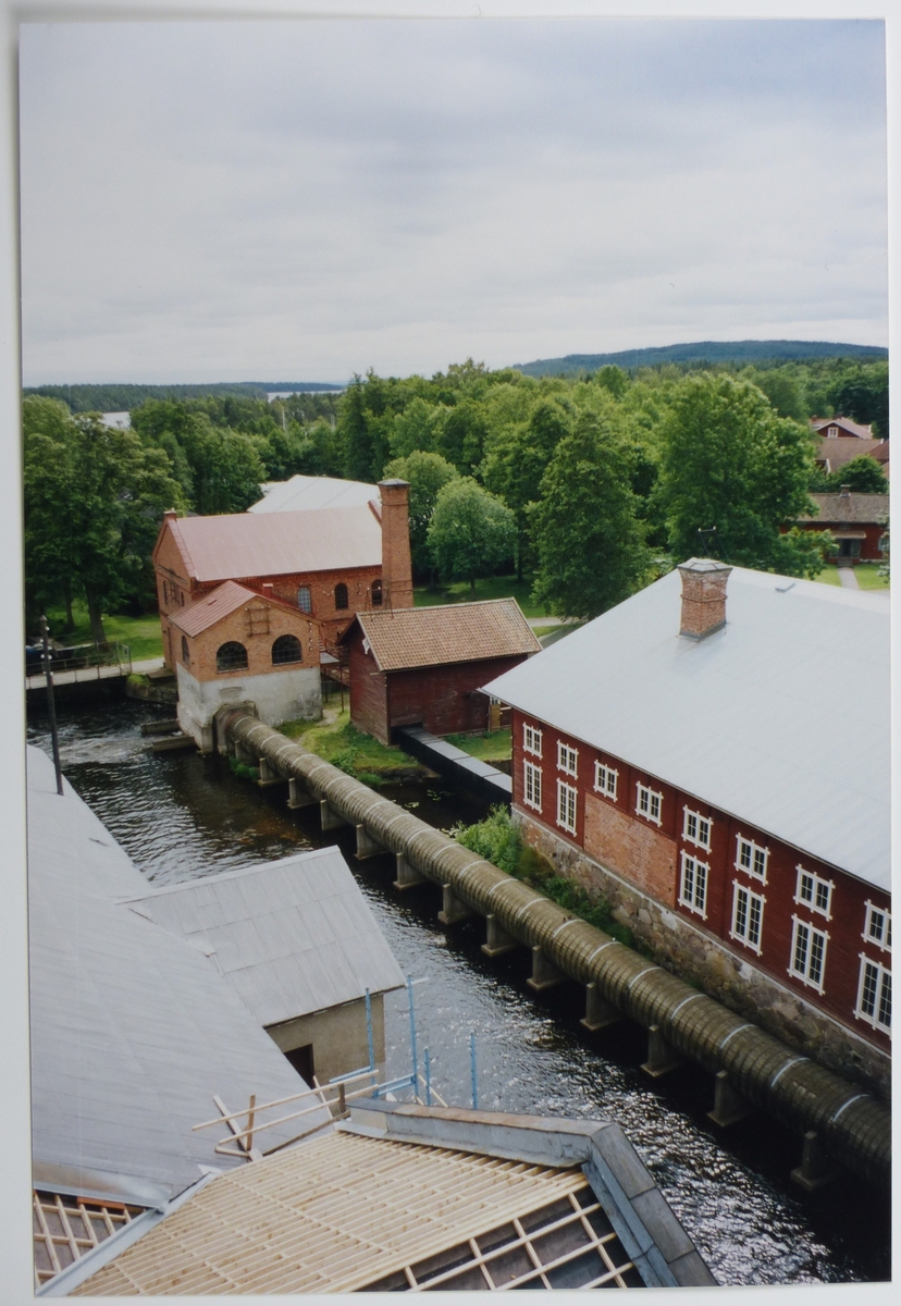 Vy från skylift vid pannrumsskorstenen mot nordväst - strömmen: Maskinverkstaden, Mekaniska verkstaden, Träsliperiet, Kalorifären, Elektricitetshuset
