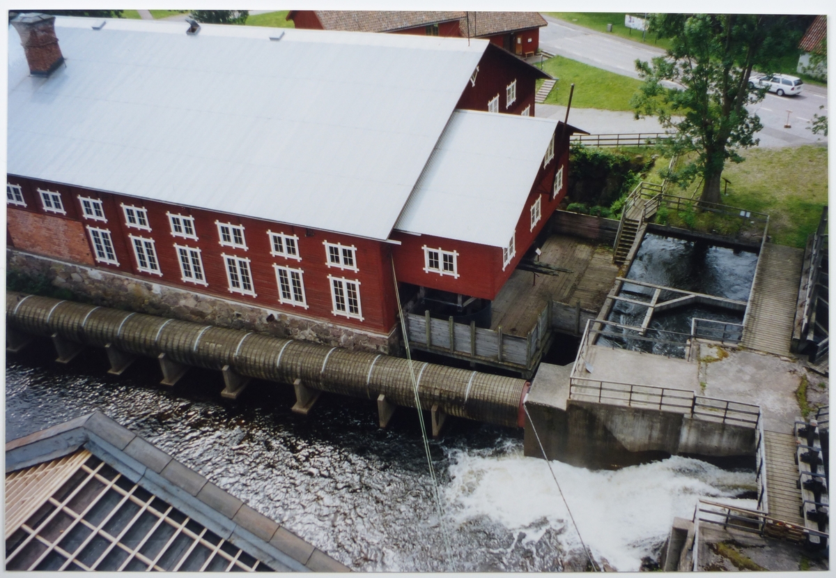Vy från skylift vid pannrumsskorstenen mot nordväst - strömmen: Maskinverkstaden, Mekaniska verkstaden, Träsliperiet, Kalorifären, Elektricitetshuset