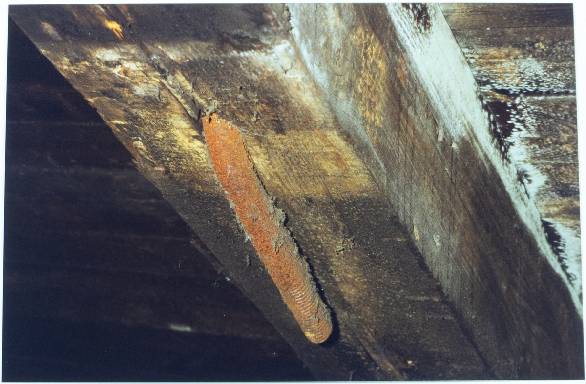 Gjuteriet, detalj interiör, böjd buit för infästning av bärbjälke för ventilationshuv, avfasning av takstol, östra ventilationshuven, ursprunglig placering