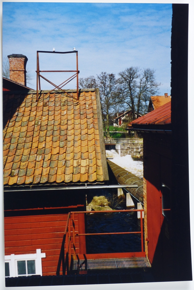 Utsikt från Elektricitetshusets övervåning, utrymningsvägen, mot strömmen, Kalorifären till vänster, tillbyggnad Elektricitetshuset till höger.