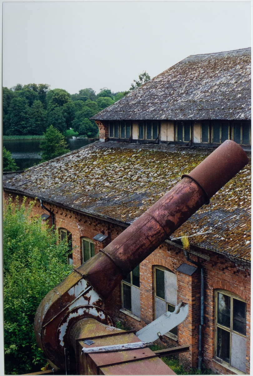 Gjuteriet, sett från Brukskontorets övervåning, sandbehållare i förgrunden, taket läcker in, takavvattning trasig, tegelfasad frostskadad, fönsterrutor provisoriskt lagade