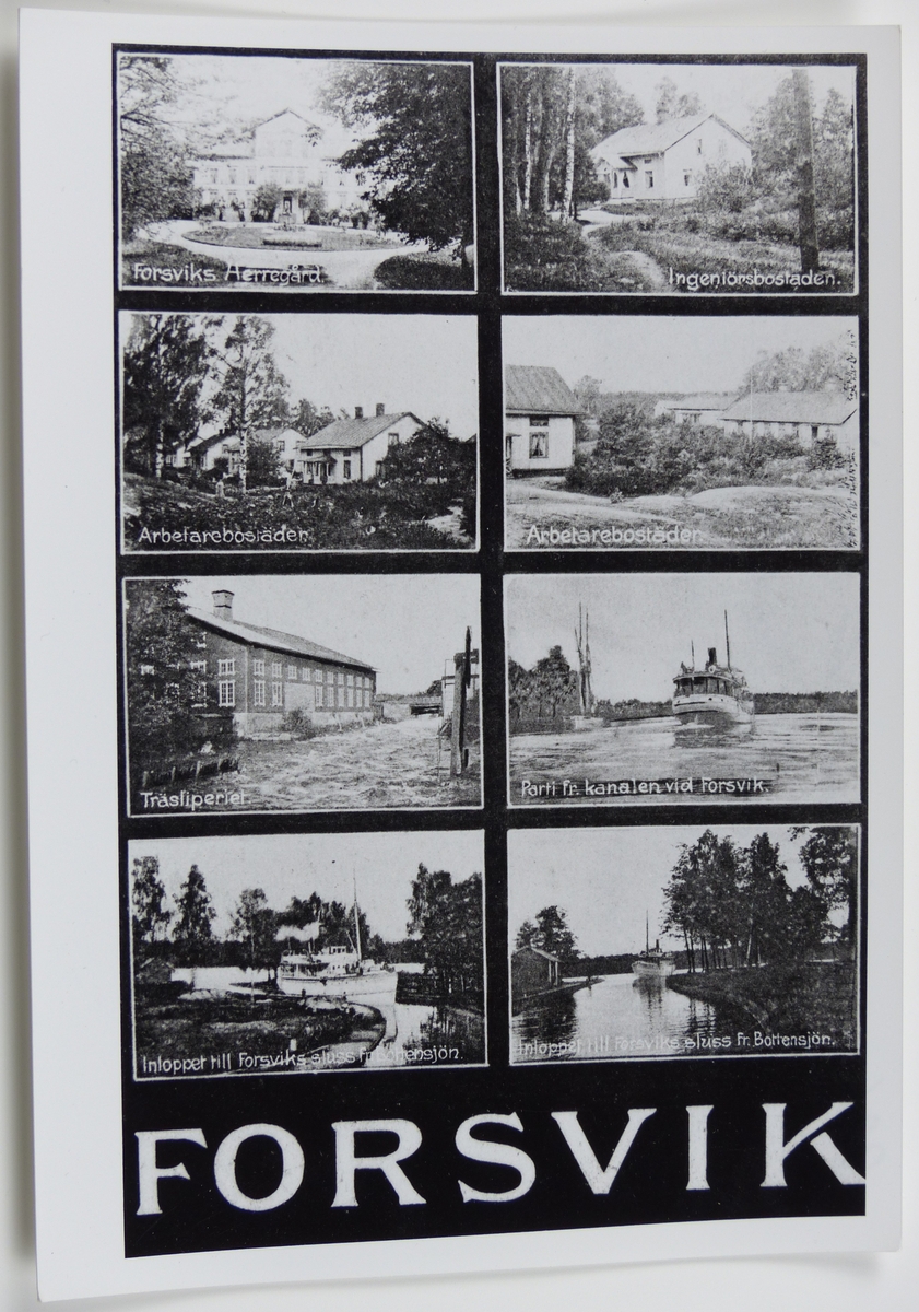 Svart-vit fotografi på vykort över Forsvik. Avbildad är Forsviks herrgård, Ingeniörsbostaden, Arbetarbostäder, Träsliperiet, parti från kanalen vid Forsvik, inloppet till Forsviks sluss från Bottensjön. Eftersom arbetarbostäderna är ljusa och trätuben saknas till elektricitetshuset måste bilderna vara tagna före 1922