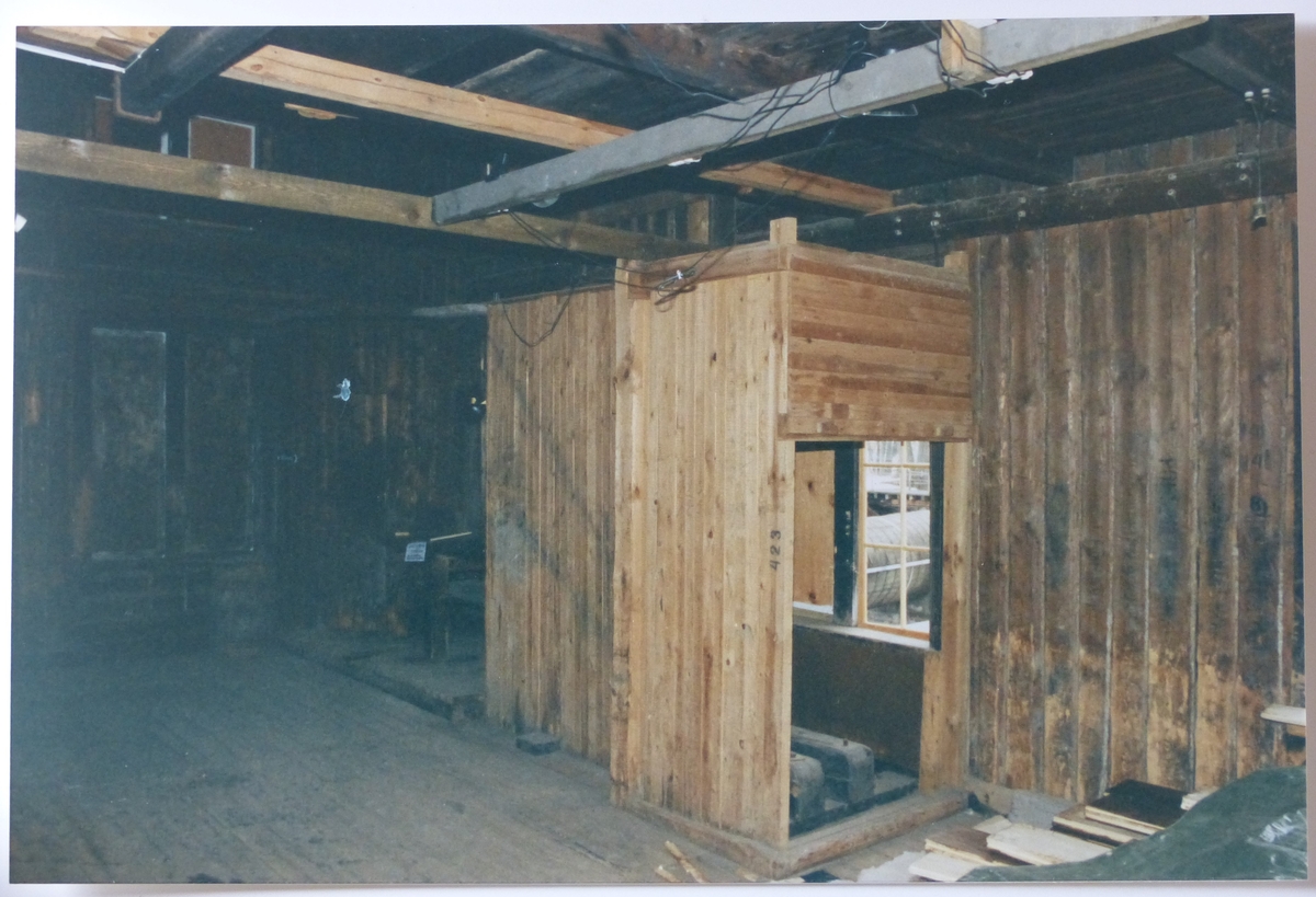 Träsliperi före renovering. Utställningslokal, östra hörnet.