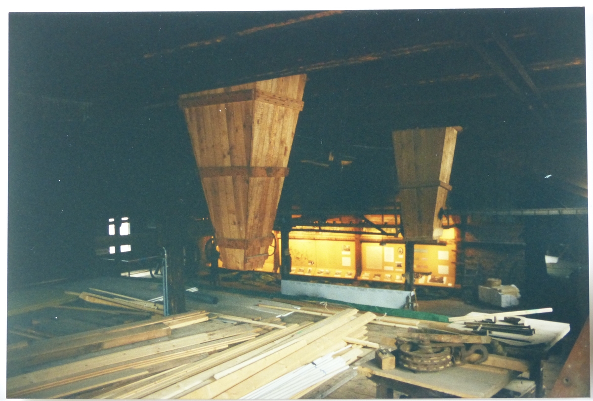 Träsliperi före renovering. Spånutkast över receptionstak.