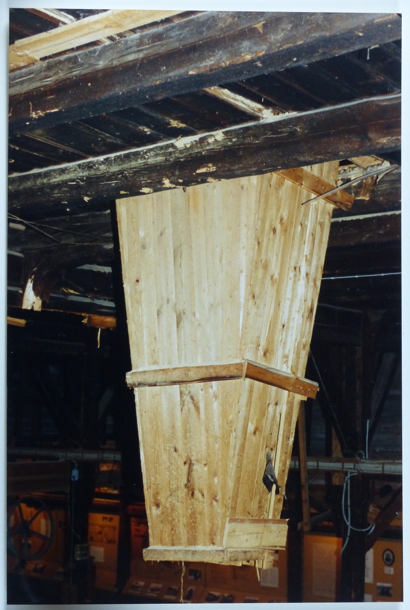 Träsliperi före renovering. Spånutkast över receptionstak.
