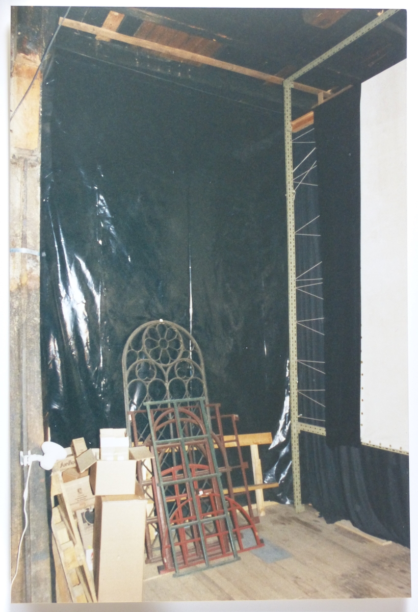 Titel: Träsliperiet före renovering. Bildspelslokal, mot vägg till "slipstolar".