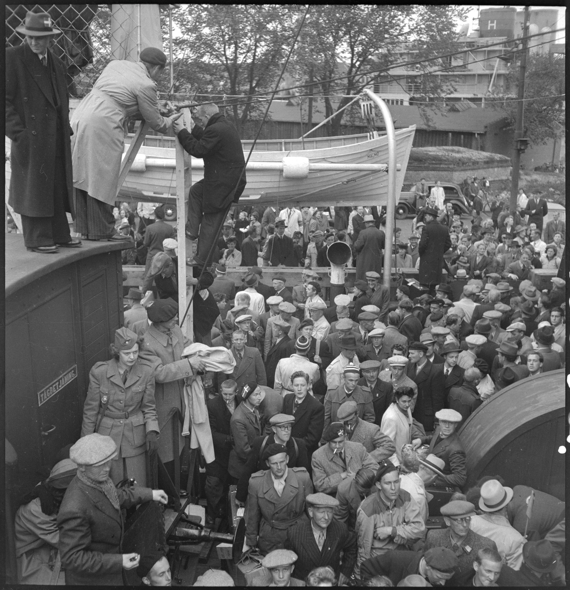 Titel: Danska flyktingar på väg hem, ombord på tågfärjan Malmö. Här på väg in till Köpenhamn.
