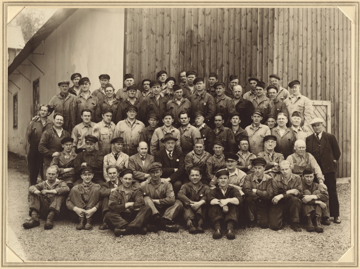 Trafikaktiebolaget Grängesberg - Oxelösunds Järnvägar TGOJ gruppfoto på verkstadspersonal utanför verkstaden i Kopparberg.