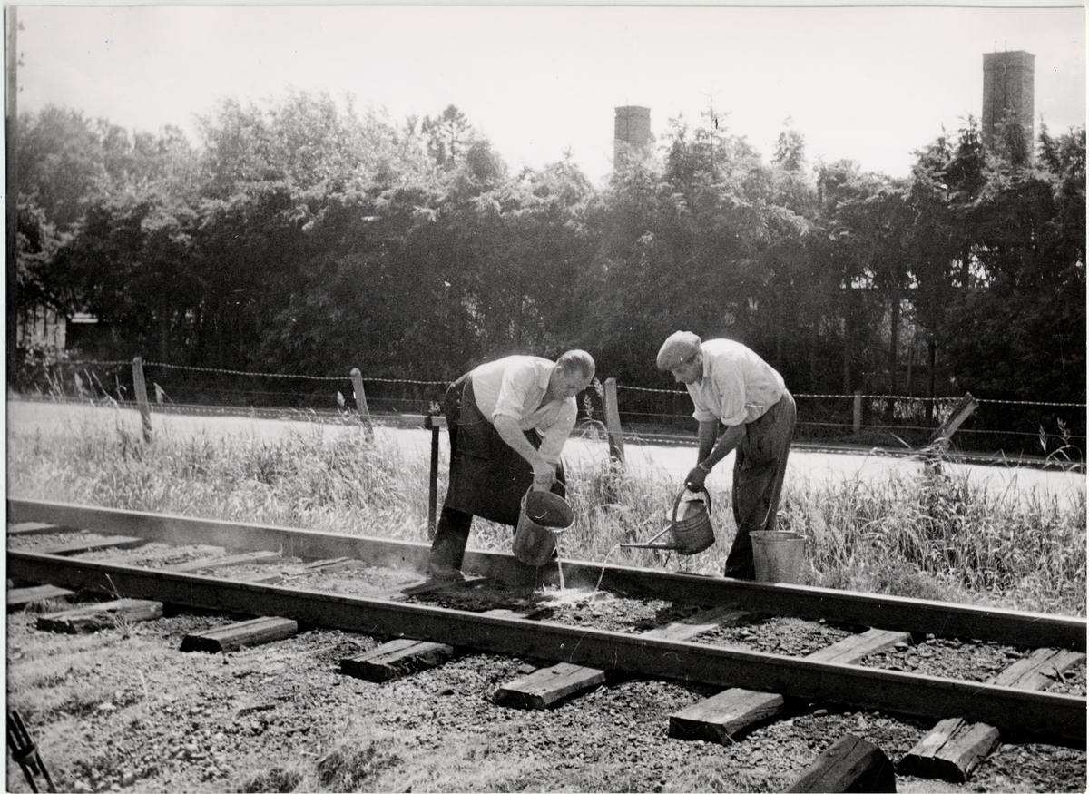 Brandchefen, handelsträdgårdsmästaren Sven Karlsson och brandmannen, trädgårdsmästare Gösta Jakobsson, släcker eldsvådan i spåret vid Hässelvy villastad station.