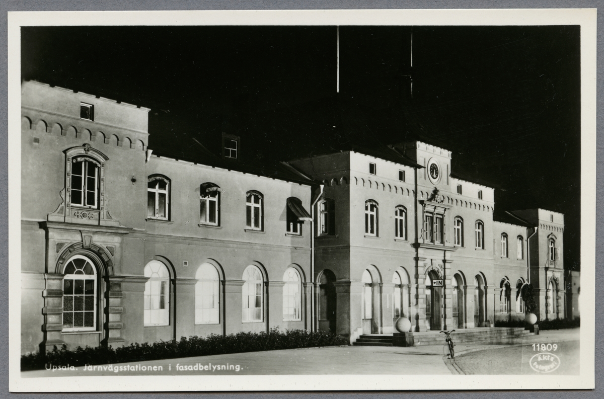 Stationshuset i fasadbelysning i Uppsala.