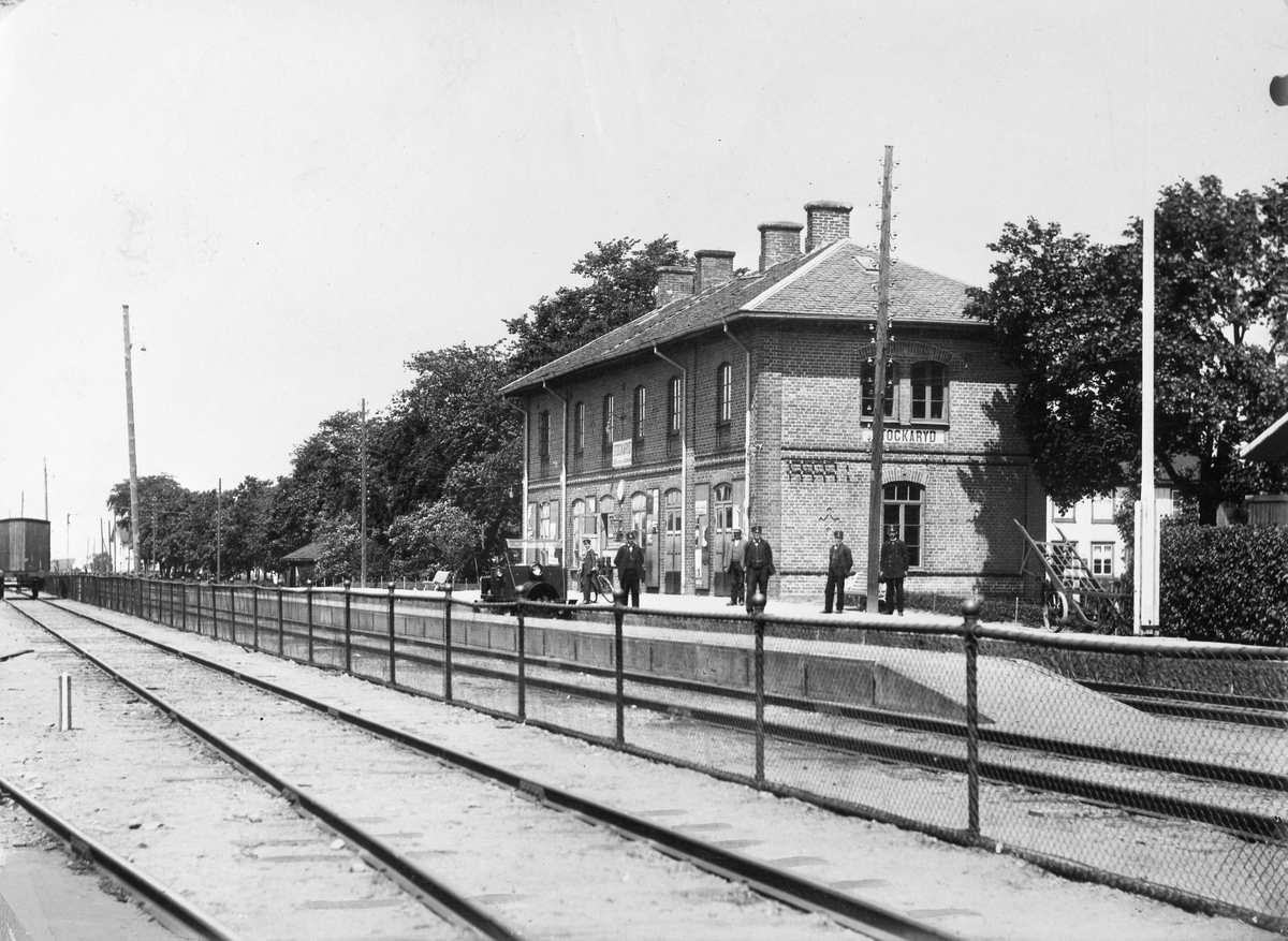 Enligt text på baksidan av kuvertet: "Rött tegel, vit fog. Skyltar vita med svart text. Mörkgröna fönster o. dörrar, de senare med svart nederdel. Tak gråbrunt med zinkbeslag. Dressin blå med röd ram om skyddsglaset. Lilla huset rött."