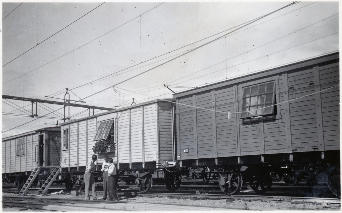 Kockvagnen med en bostadsvagn på var sida i Östersund 26 juni 1944. Statens Järnvägar SJ Eid 523 och SJ Eid 535.