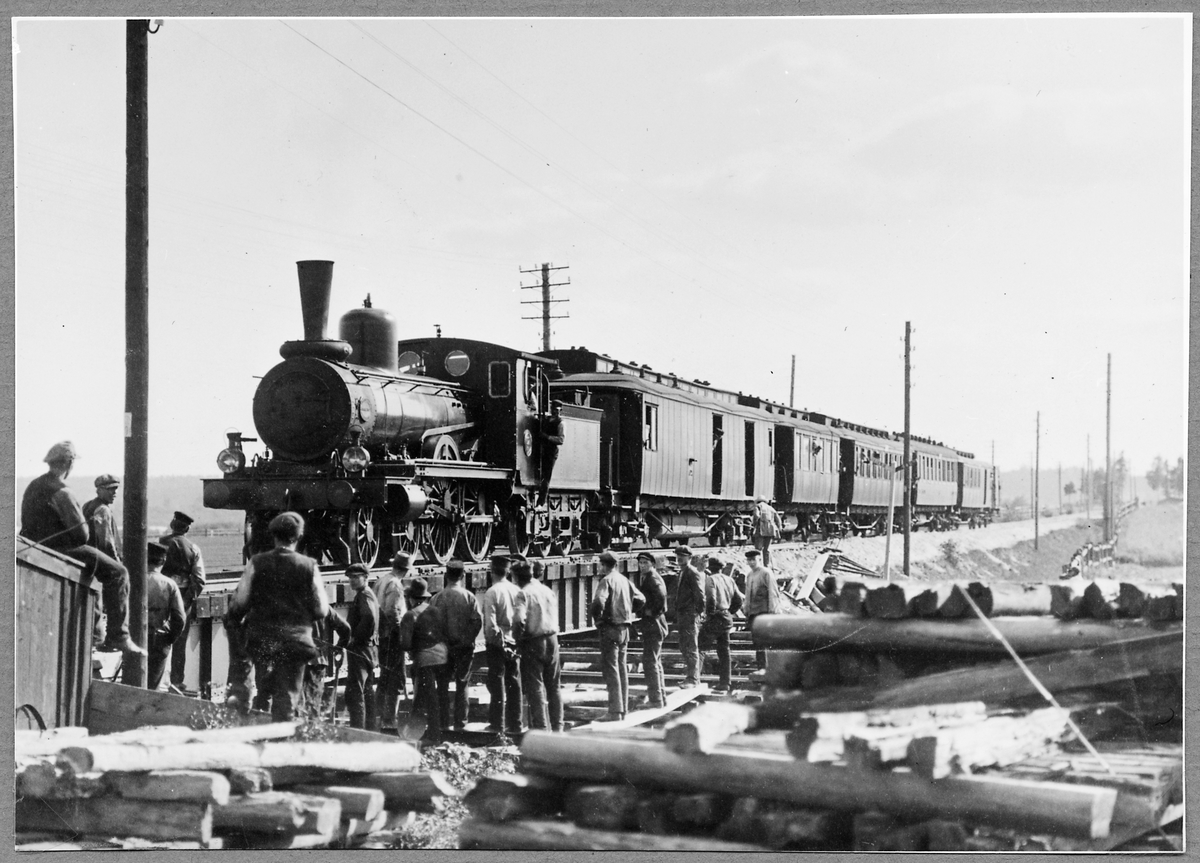 Byte av bron över Vallbyån i Storvik. Persontåg draget av Statens Järnvägar, SJ Cc 558 med vagnar DFo1, C3b, Co1, BCo3 m12, CFo och eventuell G3.