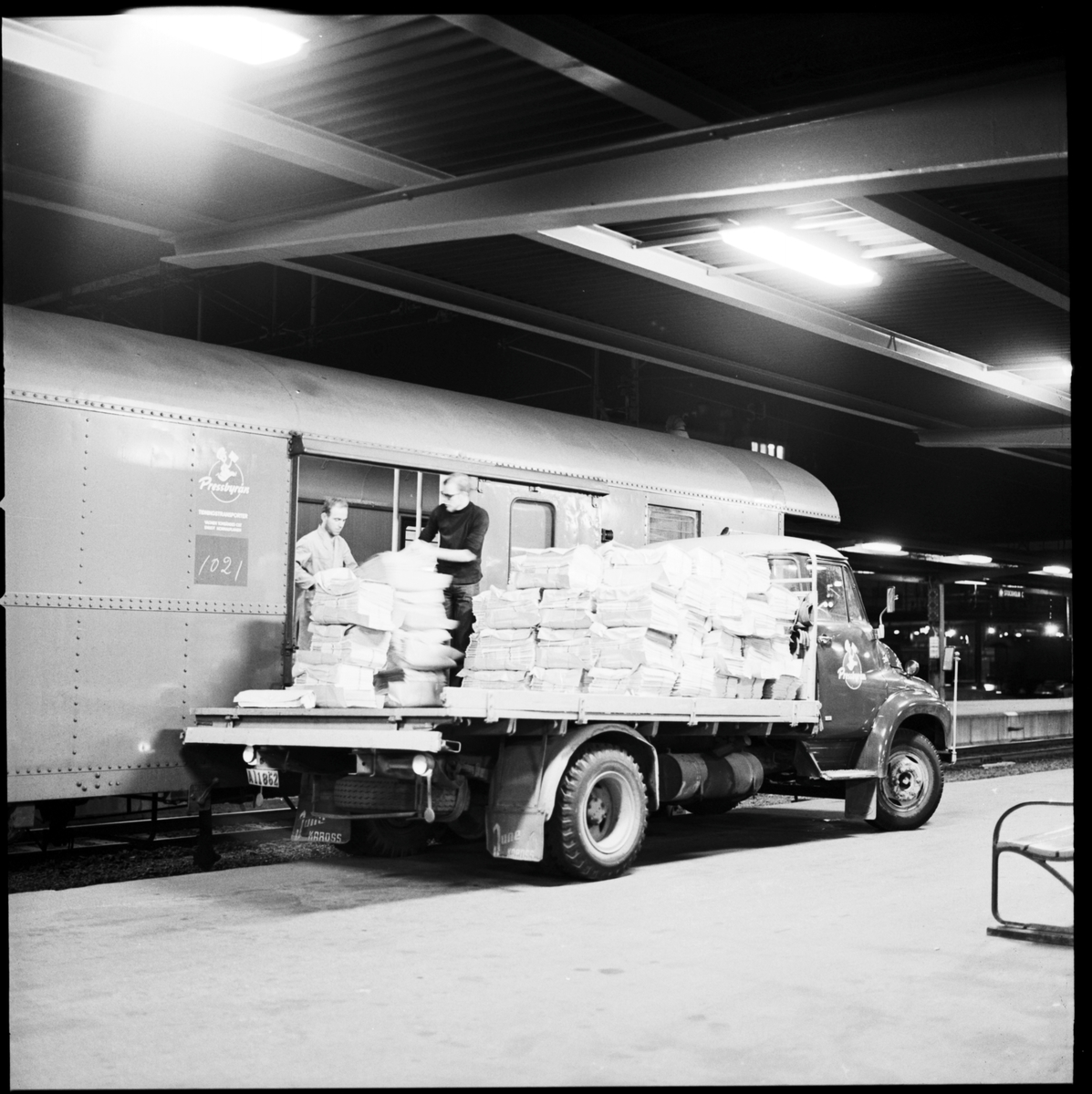 Titel: Tidningslastning Pressbyrån, mellan lasbil och för sortering / buntning ombyggda person - resgodsvagnar.