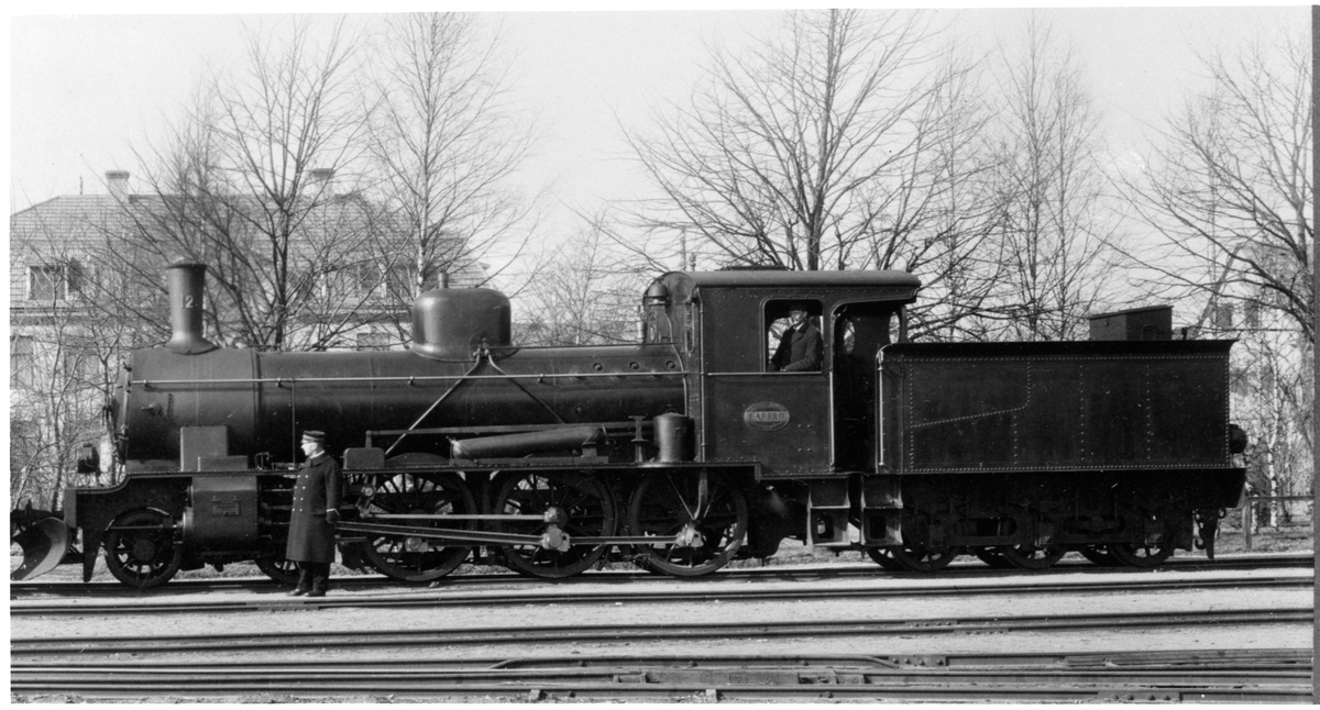 Gotlands Järnväg, GJ lok 12 "Lärbro" med lokförare i hytten och personal på spåret bredvid.
