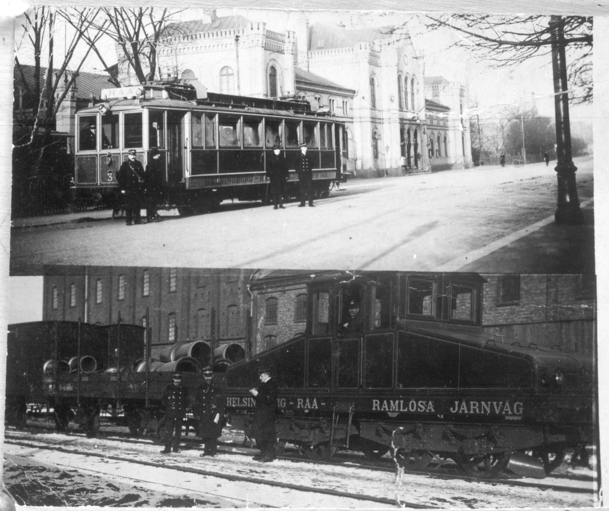 Övre bilden: Helsingborg-Råå-Ramlösa Järnväg, HRRJ spårvagn med personal utanför Järnvägsstationen i Helsingborg.