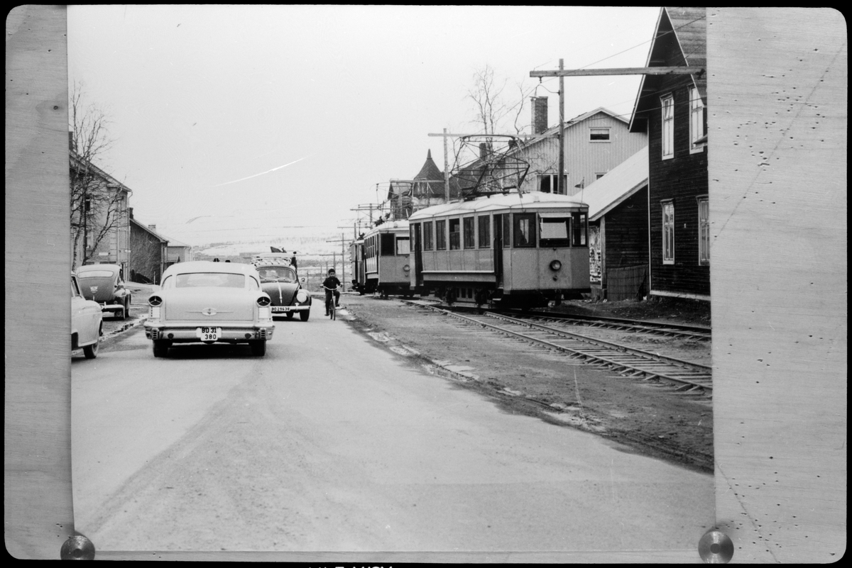 Luossavaara-Kiirunavaara Aktiebolag, LKAB spårvagnar vid mötespåret på Adolf Hedins väg i Kiruna. Det är sista turen för de tre vagnarna då spårvägen lades ner den 29 maj 1958.