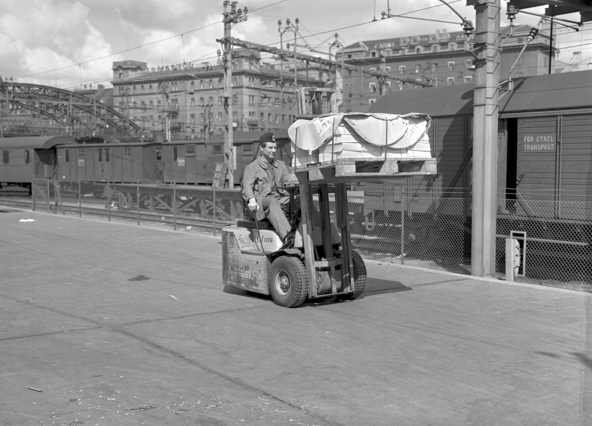 Gaffeltruck med pallgods. Cykeltransportvagn och resgodsvagnar skymtar