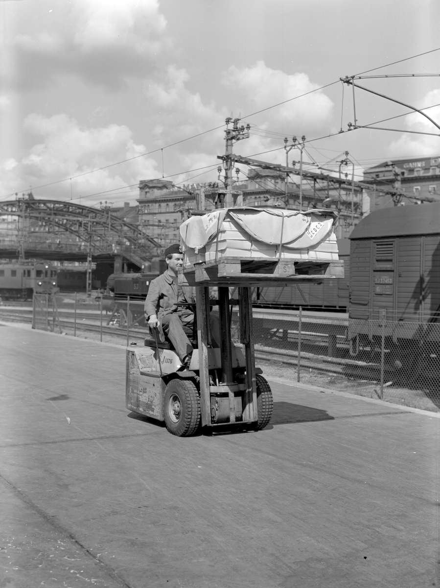 Gaffeltruck med pallgods. El- och ånglok skymtar