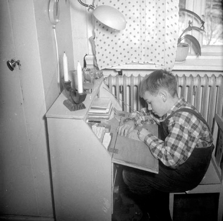 I en lägenhet i Jönköping sitter en pojke vid sekretären och skriver .