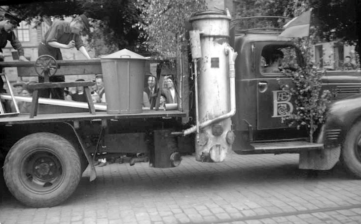 En lövad gengaslastbil med två män i verksamhet på flaket. På soffan vid kanten av den gatstensbelagda gatan sitter några åskådare.