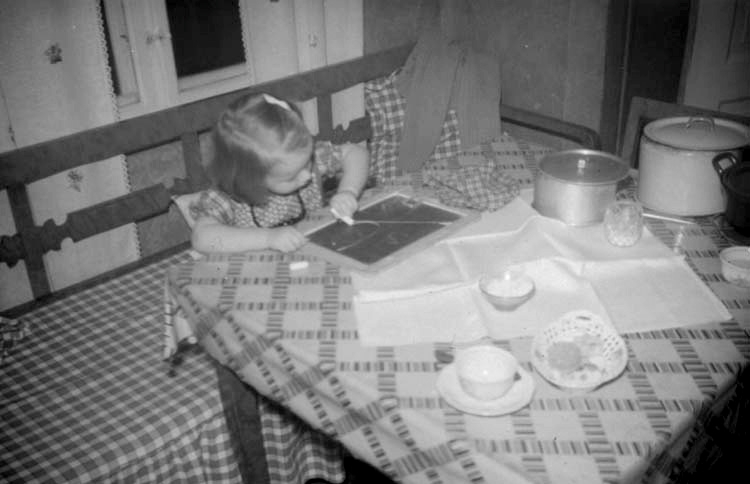 En flicka sitter på soffan vid köksbordet och ritar på en griffeltavla.